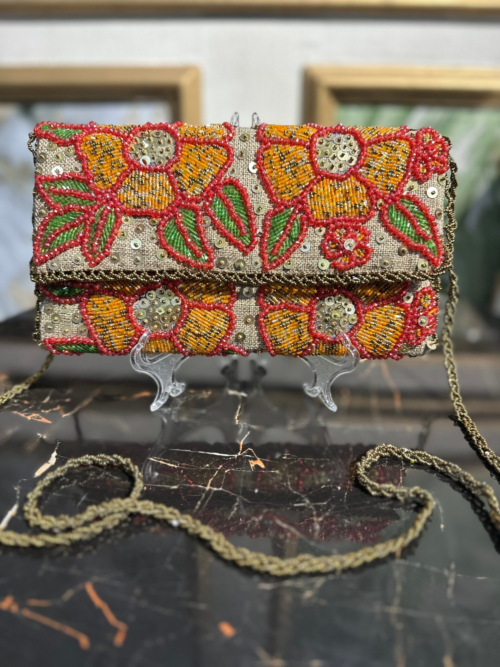Introducing the handmade classic clutch, a perfect blend of artistry and functionality. Designed with meticulous craftsmanship, this clutch is adorned with an exquisite combination of beads and shimmering sequins, making it a versatile accessory for any occasion. Whether you’re dressing up for a formal event or adding a touch of sophistication to casual outings, this clutch is bound to elevate your style effortlessly.