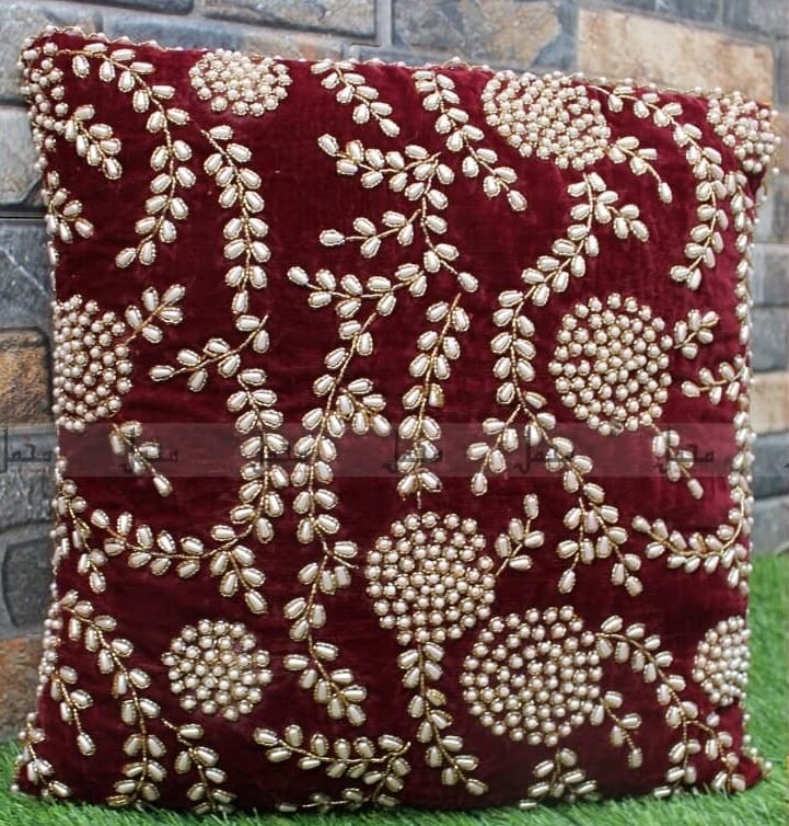 Hand Embellished cushion Covers Made on maroon velvet with white pearls and gold beads with heavy pattern.