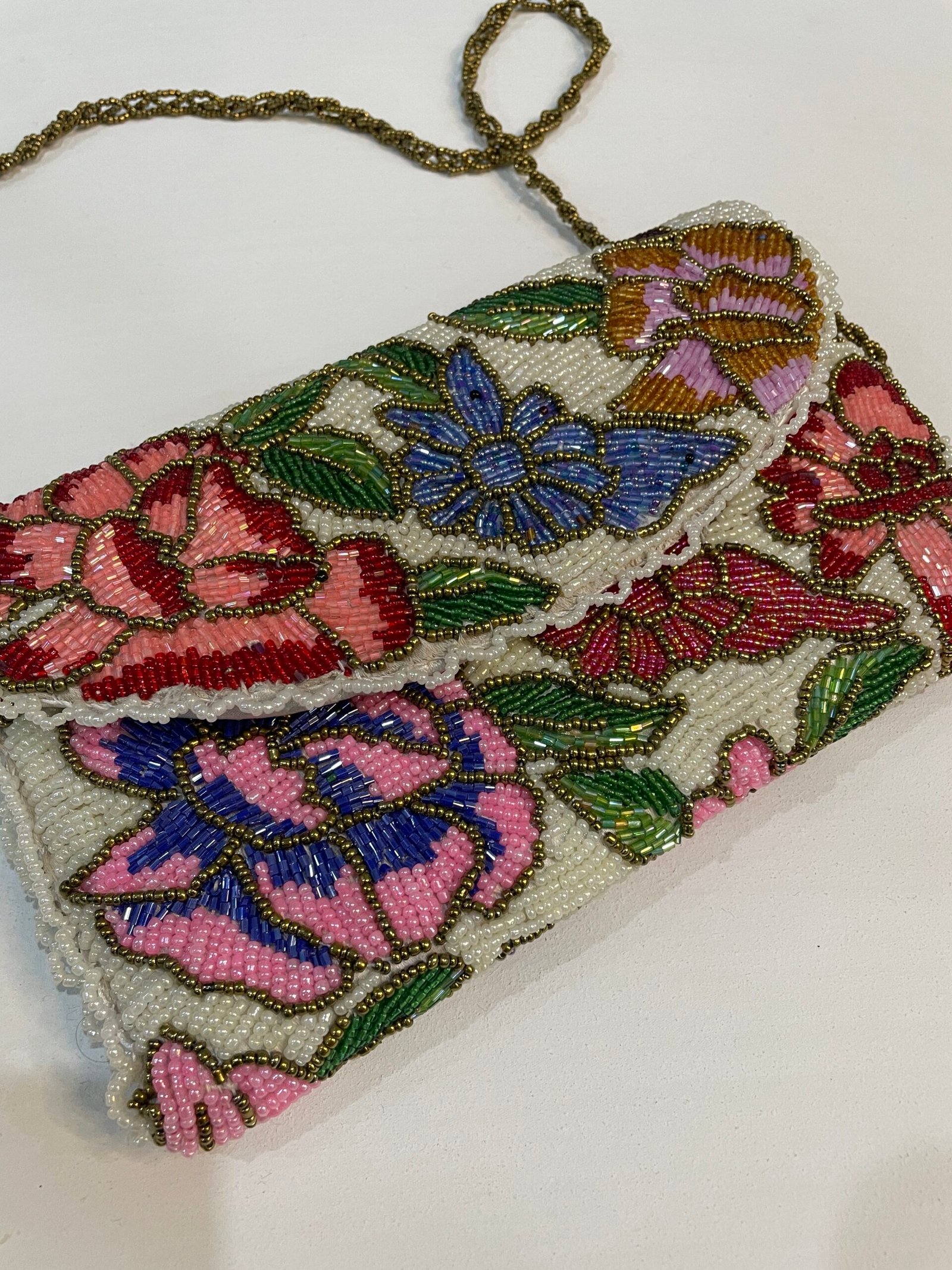 Each clutch is individually handcrafted, making it a one-of-a-kind accessory. The white beads create a beautiful snowy backdrop, reminiscent of a winter wonderland. The intricate colored patterns add a touch of vibrancy and charm, making this clutch a standout piece.