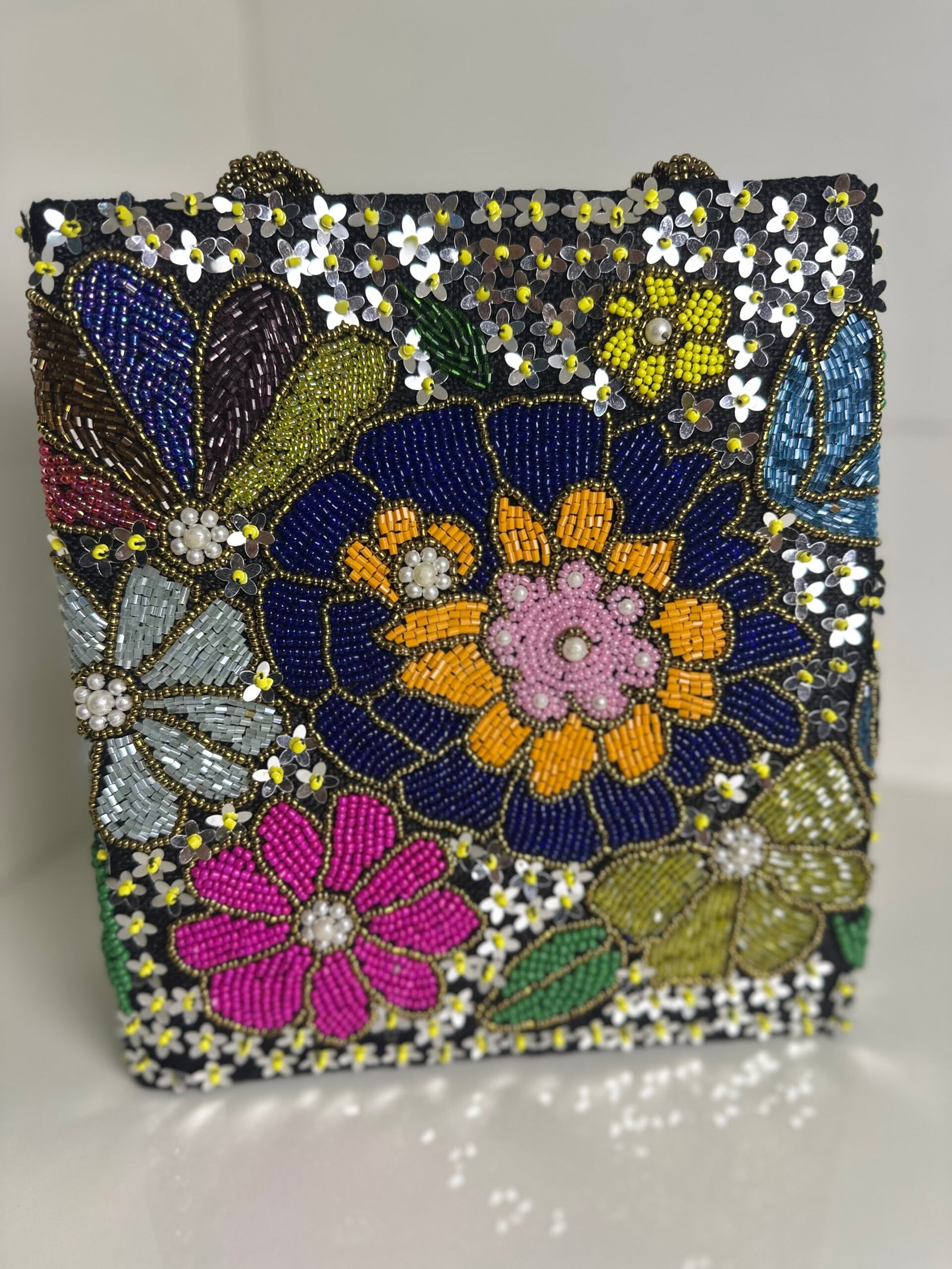 Hand embellished bag in square shape.