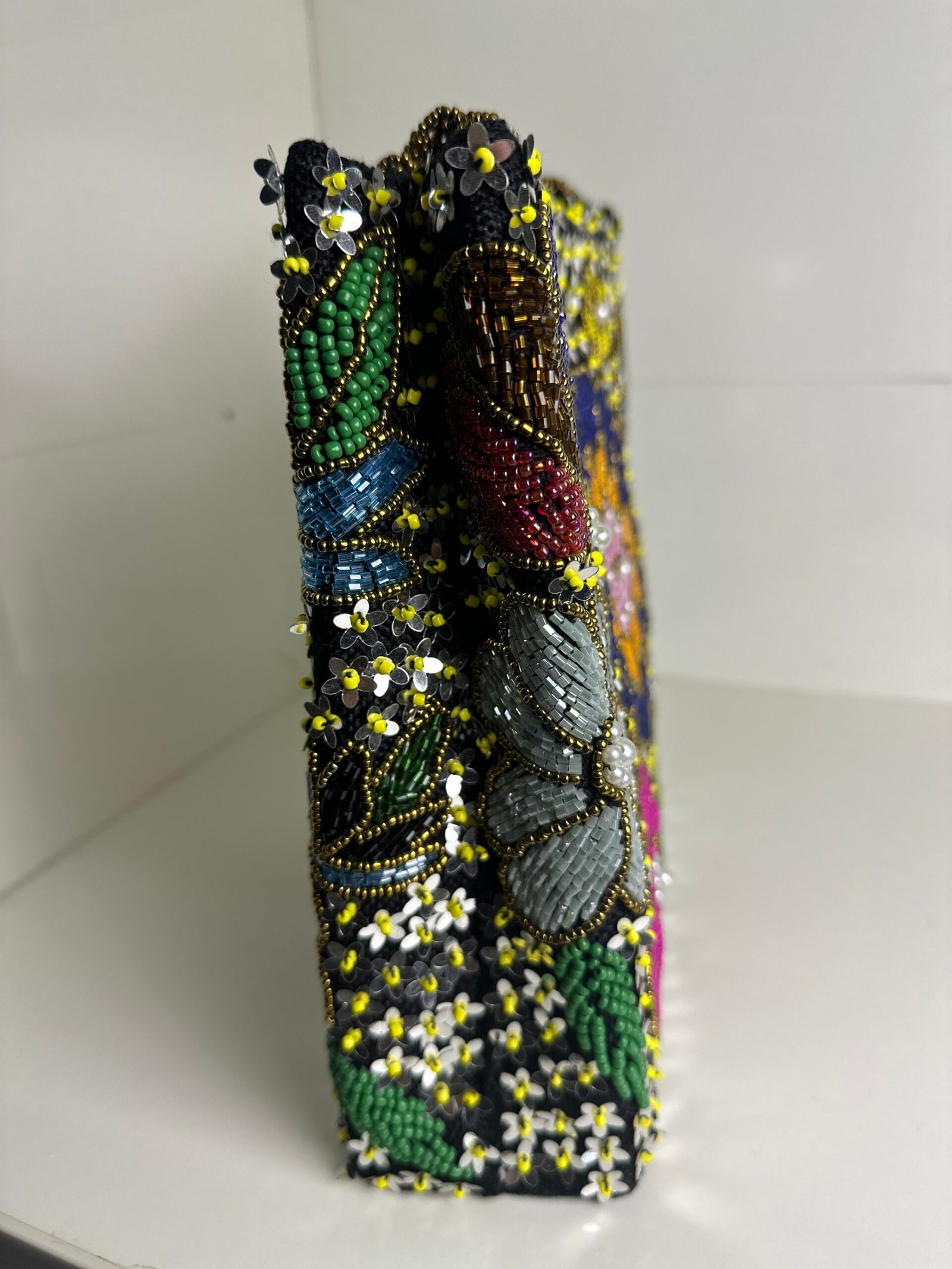 Same front and back. All beads work.Its a 5D beaded bag made with beads and sequins on Juté fabric using the embossed technique.