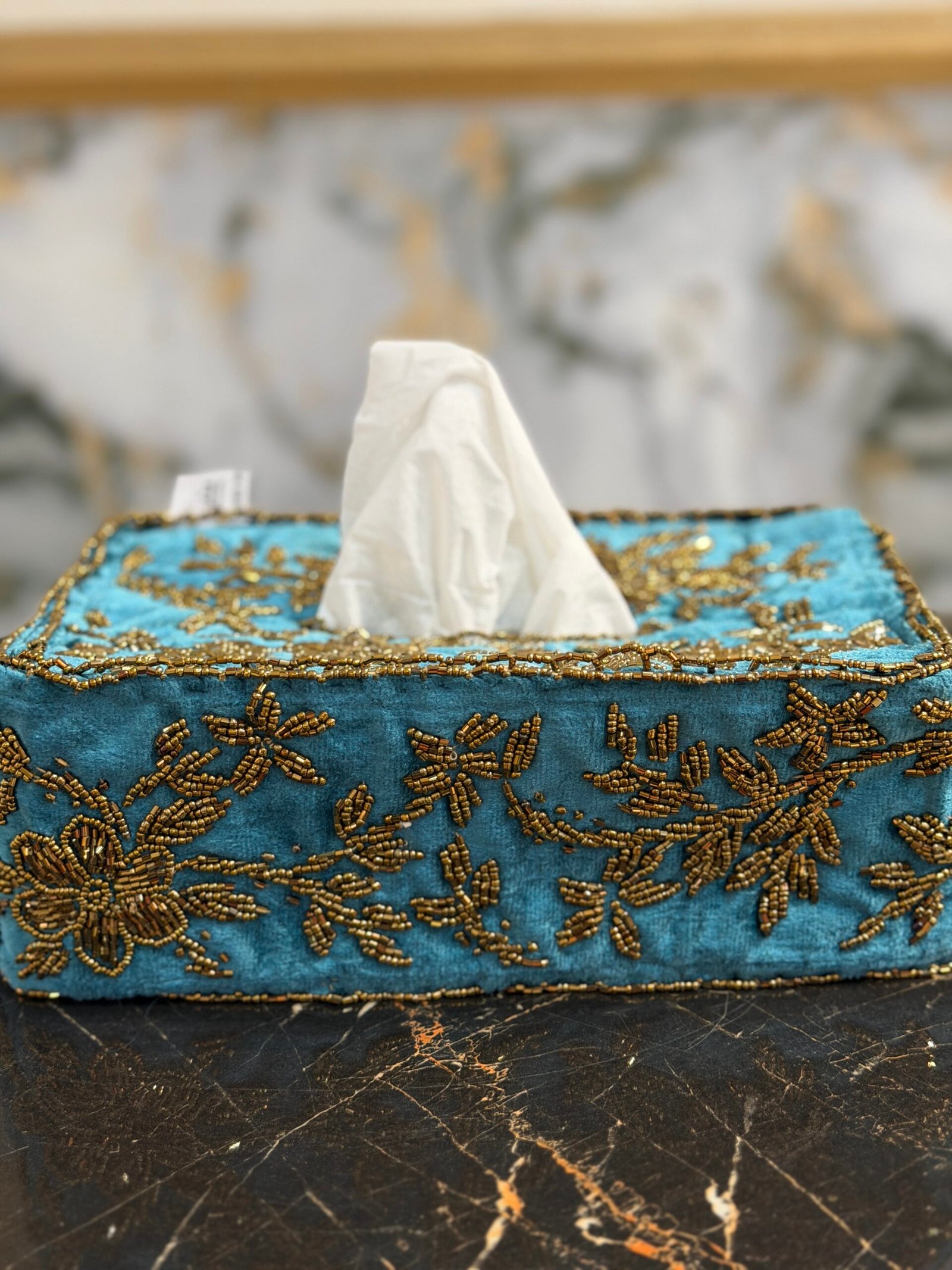 Hand embellished tissue box cover made with beads and sparkling cut dana to enhance the look of your tissue box .