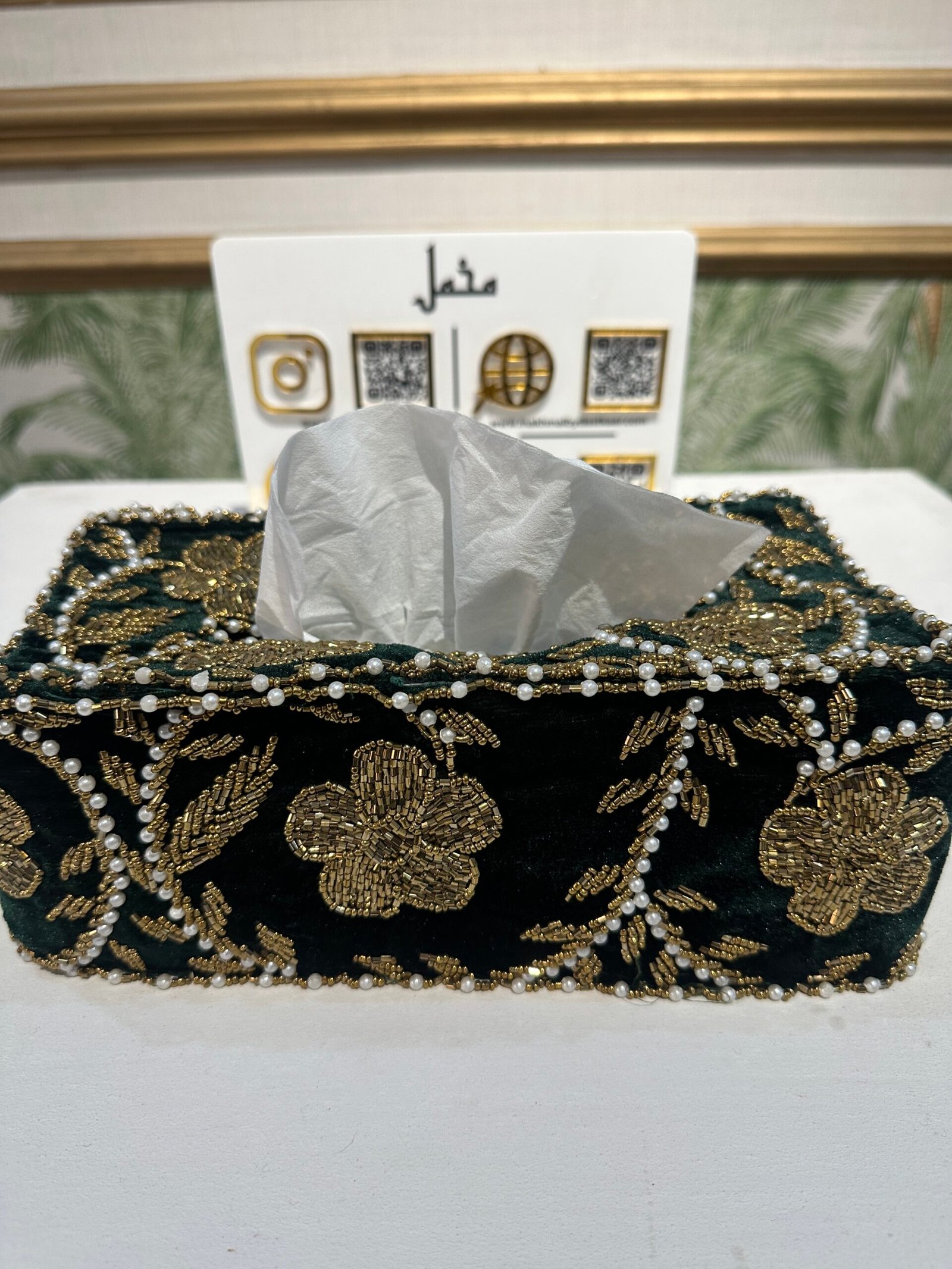 Hand embellished tissue box cover made with beads and sparkling cut dana to enhance the look of tissue box cover.