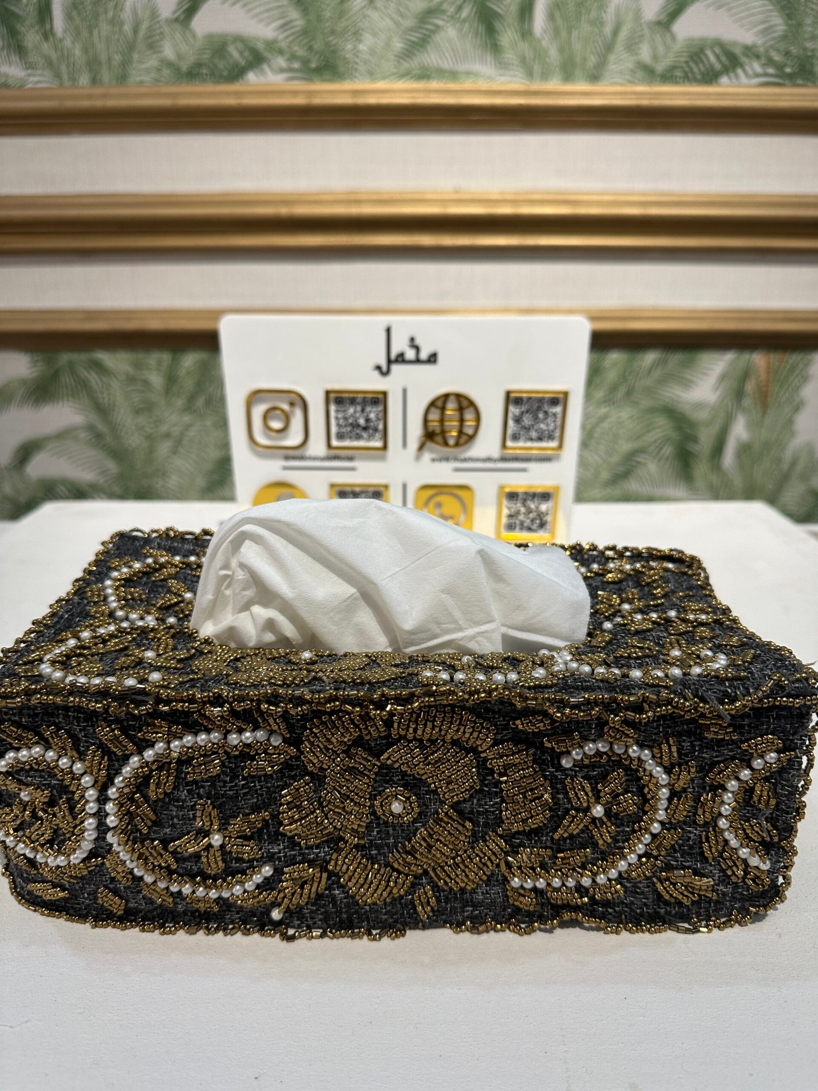 Hand embellished tissue box cover made with beads and sparkling cut dana to enhance the look of tissue box cover.