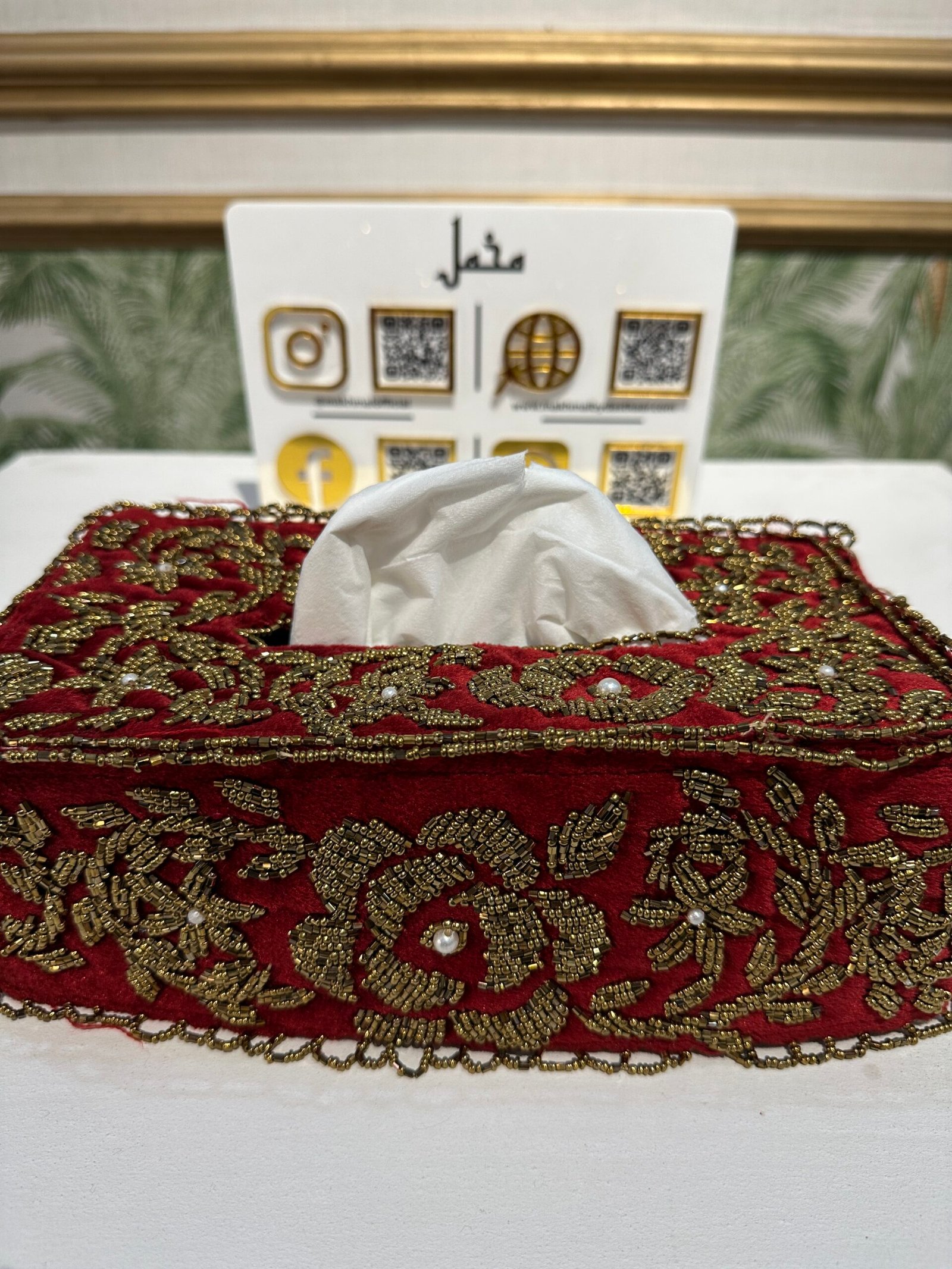 Hand embellished unique beaded tissue box cover made with round antique beads and sparkling cut dana beads.