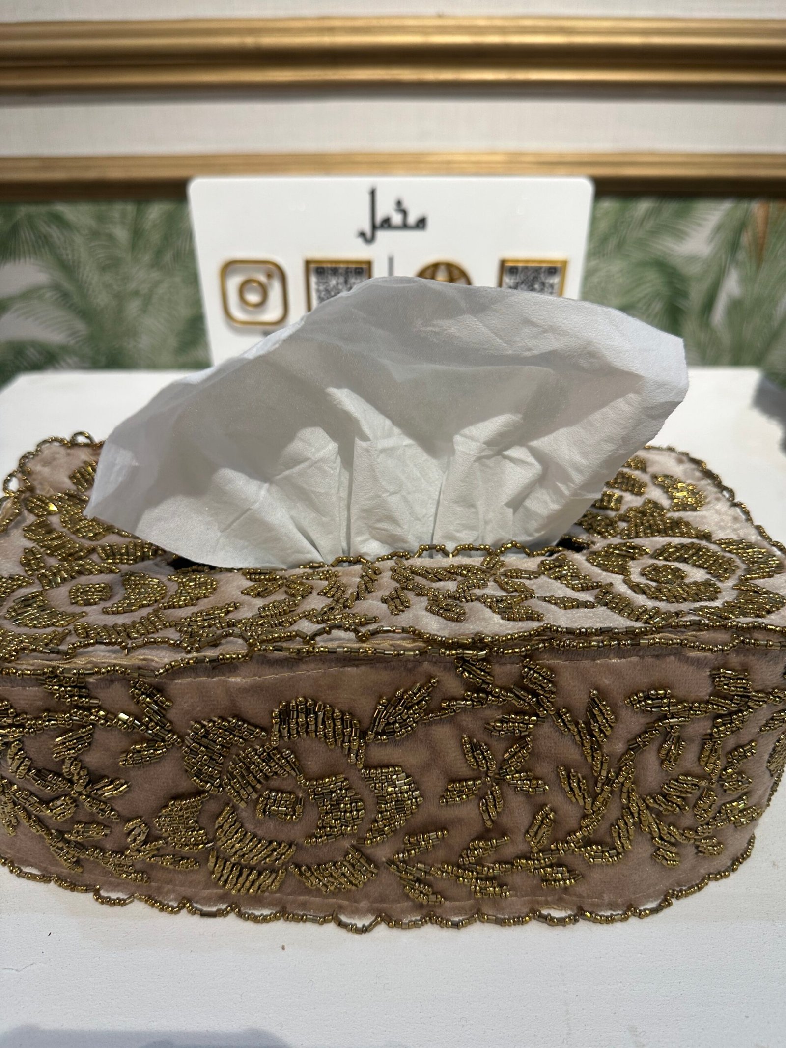 Hand embellished tissue box cover made with beads and sparkling cut dana to enhance the look of tissue box cover.