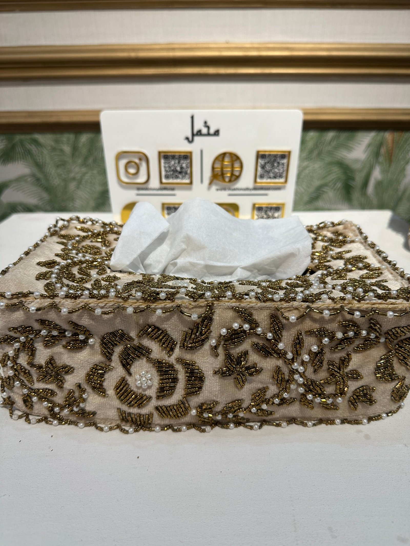 Hand embellished tissue box cover made with beads and sparkling cut dana to enhance the look of tissue box cover.