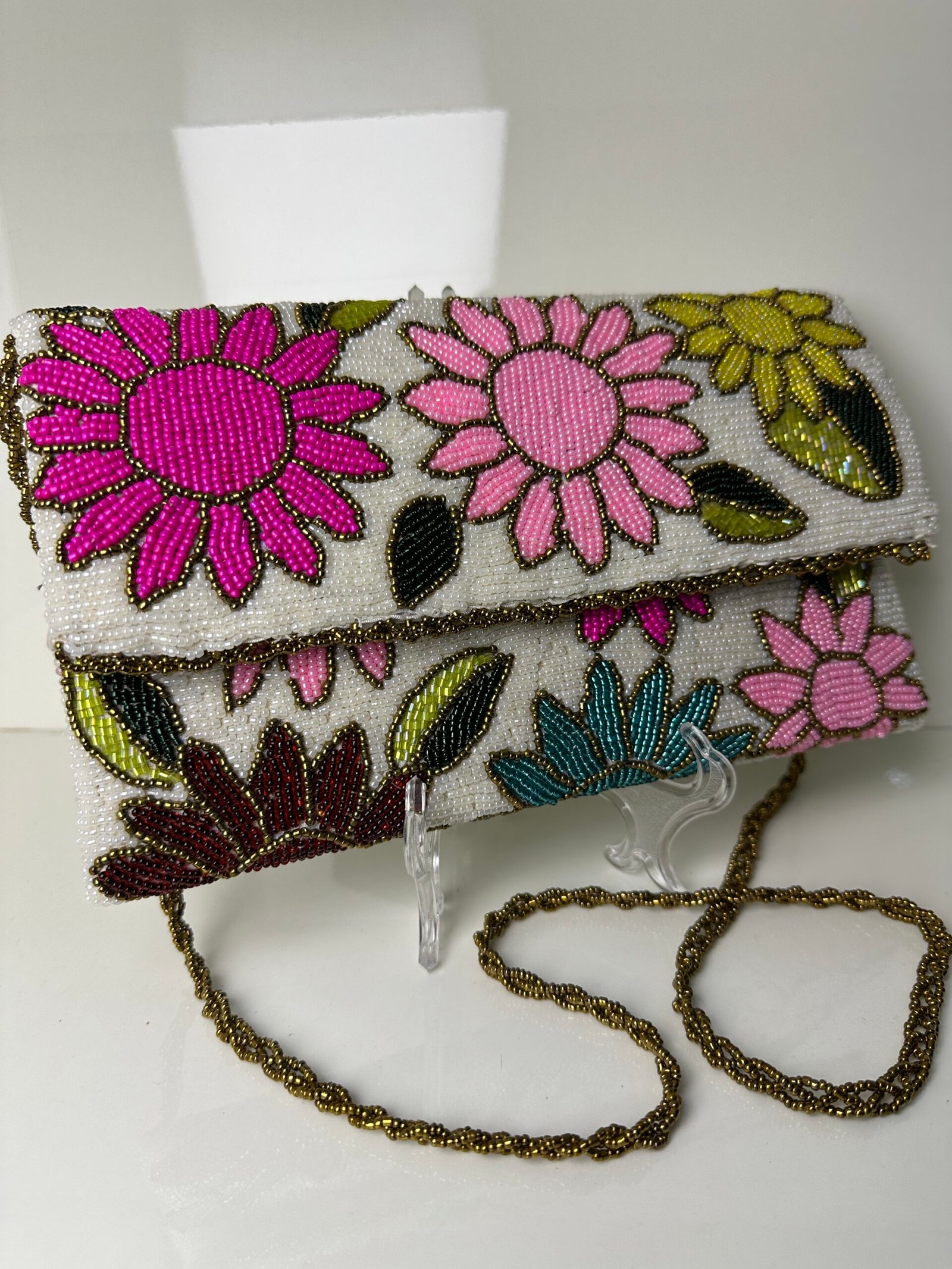 Each clutch is individually handcrafted, making it a one-of-a-kind accessory. The white beads create a beautiful snowy backdrop, reminiscent of a winter wonderland. The intricate colored patterns add a touch of vibrancy and charm, making this clutch a standout piece.