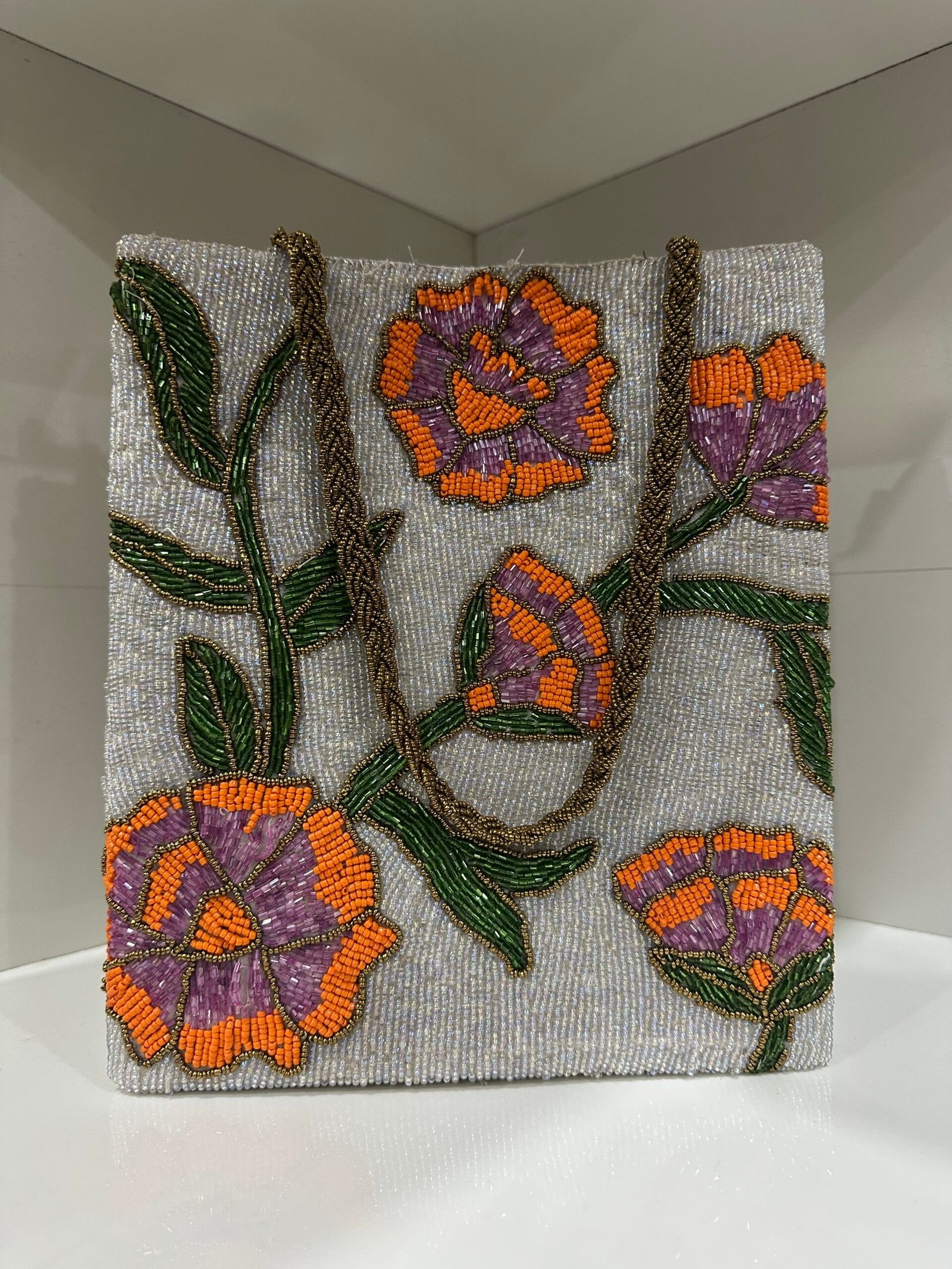 Hand embellished white bag made in unique pattern using orange colored beads.